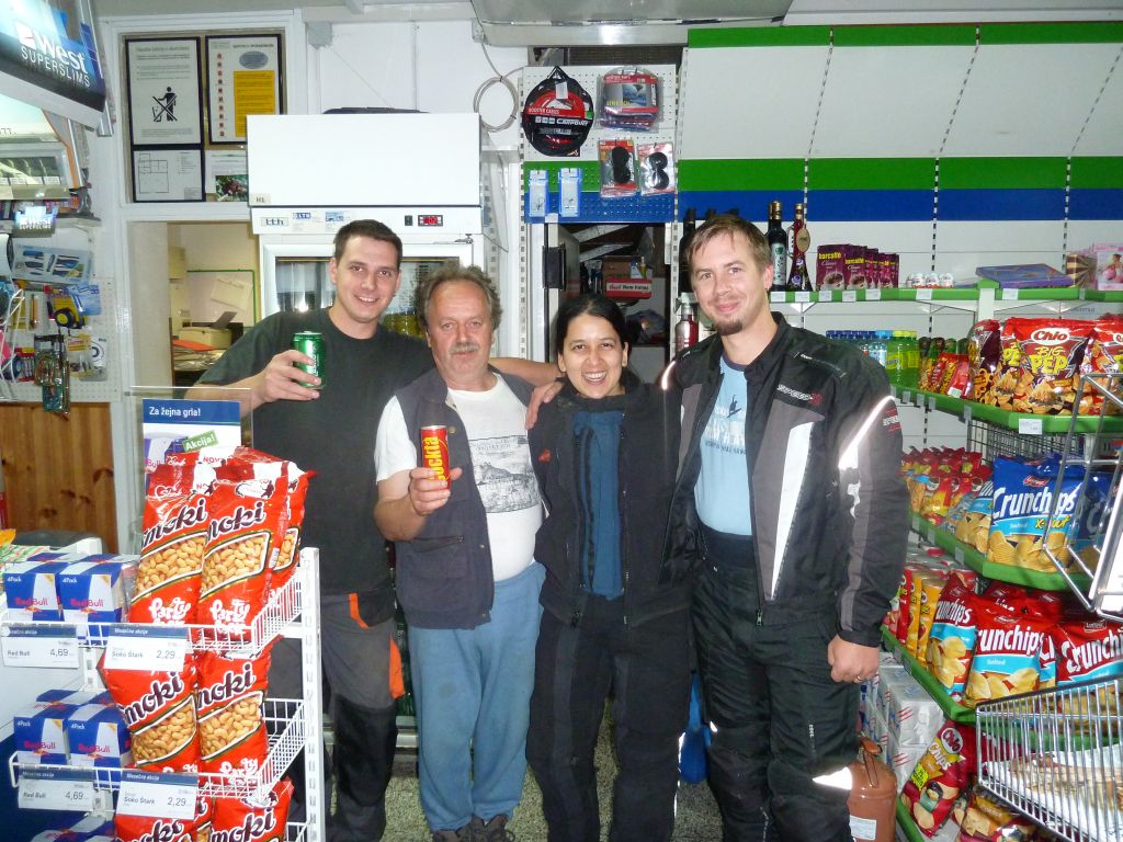 When I was ready to walk back to the bike, an older guy at the station gesticulated at me excitedly. Apparently he had heard from the young guys that I was from the US and was excitedly telling this to another guy who was fueling up his car. I walked back smiling, but a bit puzzled. He all but grabbed me by my arm and dragged me into the station, brought the gas station attendant with us to a back room and asked him to pull up Google Maps on the computer. They typed in “Seattle, Washington” and laughed with amusement as it came up. I helped zoom in a bit further and showed them where I lived. More uproar and laughter. He spoke a bit of English and told me that his father was born in Cleveland, Ohio, but he had never been able to visit there. I told them who I was and why I was there. It was all rather sweet and amusing. I asked them if I could take a picture of them, to which they consented, and they asked me how they could find me on Facebook. Ah, modern times! I wished they spoke better English (or I spoke better Slovenian). I bet I’d have had a grand time with that good bunch.