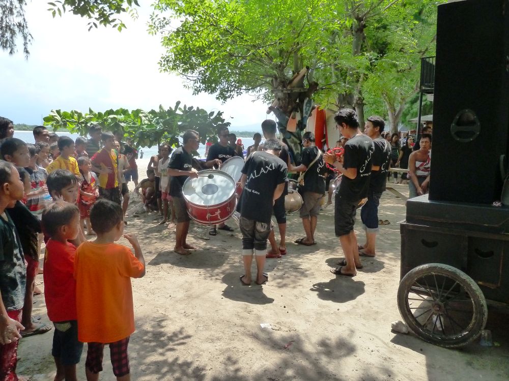 After the boat cast anchor at Gili Trawagan (luckily they stopped at island the first), we were asked to put on our shoes, climb out of the rear of the boat, and walk to the front along the edges of the boat while holding on to the railings. This was fun. When we reached the front, we had to jump off onto the beach.