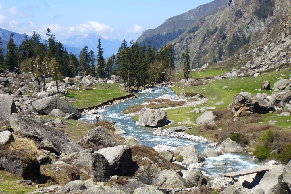 On the other side of the hut, there were other tall, craggy peaks and a river flowing through the valley.