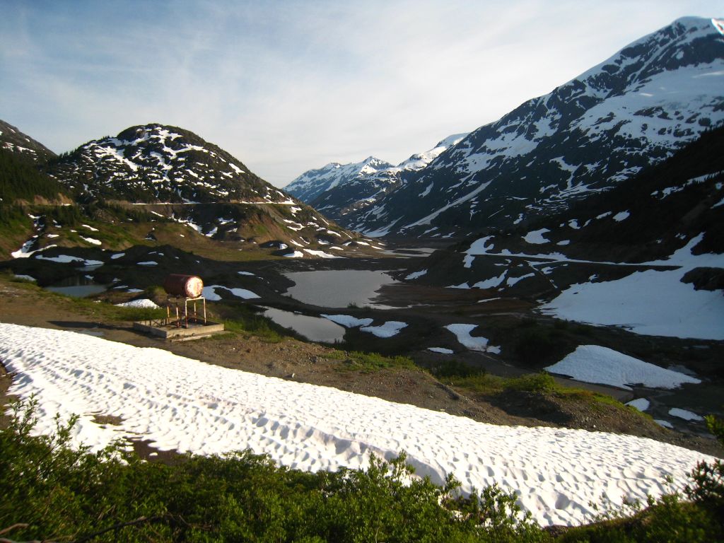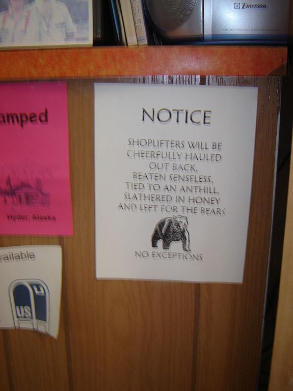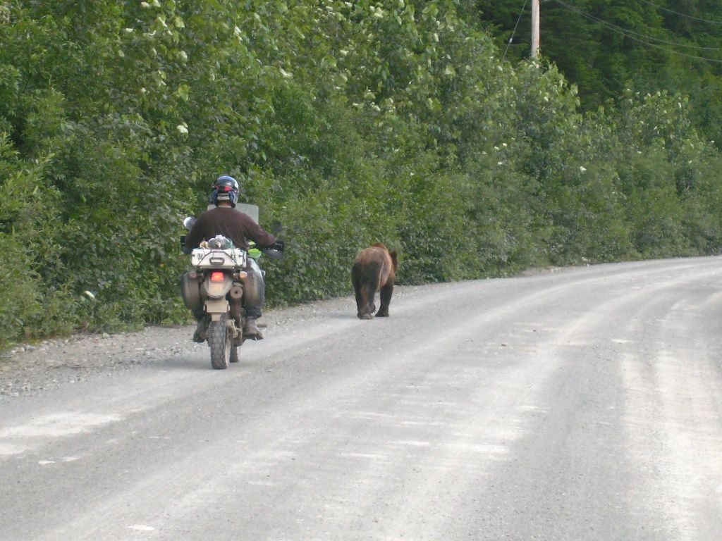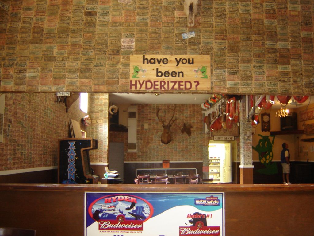 From Stewart a mile long gravel road leads into the town of Hyder, AK. A dead-end town as it were, and this is also the road that leads out of town. This was our second border crossing back into the United States, although curiously enough we did not have to go through customs to get in. We were finally in ALASKA! This was of course a minor triumph because no roads lead from Hyder to the state of Alaska, and you have to come back out and ride north for about a thousand miles north before getting to Alaska again, but even so, it was something. The only reason for us to go here was that we had consistently been told by riders to visit here and get “Hyder-ized”. We didn’t really know what this entailed but were keen on finding out. :)