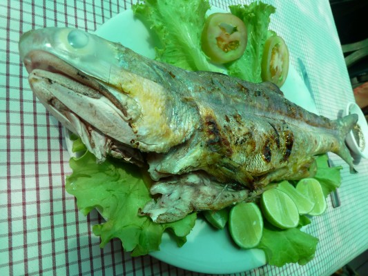 We stopped for lunch at what looked like a good sized town in a restaurant right by the water. Next to the restaurant was a pretty busy fish market. It looked like the local people had all turned up to their week’s shopping on Sunday. I ordered a grilled fish, which was delicious as usual. Nicole got a delicious squid lime soup. It looked so simple and looked so easy to make that I made a mental note to try making it at home someday.