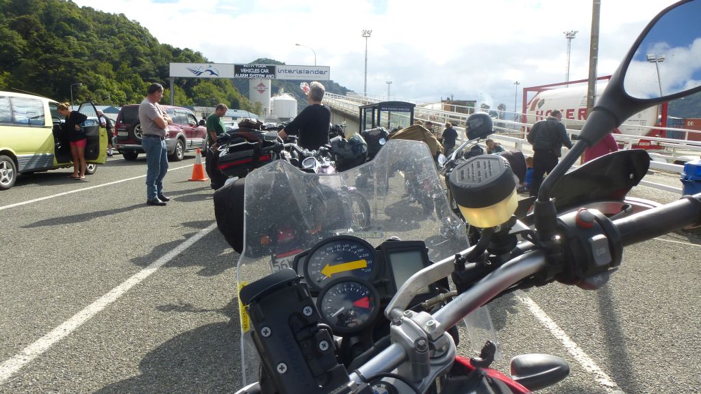 Today I wound up my travels on the South Island and got on the ferry to Wellington in the North Island. My ferry was at 1:15 PM and we were instructed to get there at 12:15 PM. I decided to go a bit earlier and got there at 11:45 AM. This worked out well because I was at the front of the line in a big group of motorcyclists who were returning from a rally in Queenstown, and not so good because the ferry was running late and I had to stand there for almost an hour.