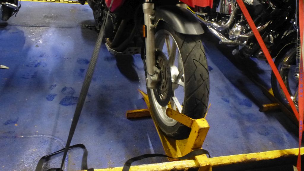 When they signaled to us, we rode towards the ship and were guided to park in special motorcycle parking. This involved wedging the front tire into a triangular metal structure and using tie-downs to secure the bike on both sides. I didn’t  have any but one of the riders lent me one of his, and the ferry provided another one.