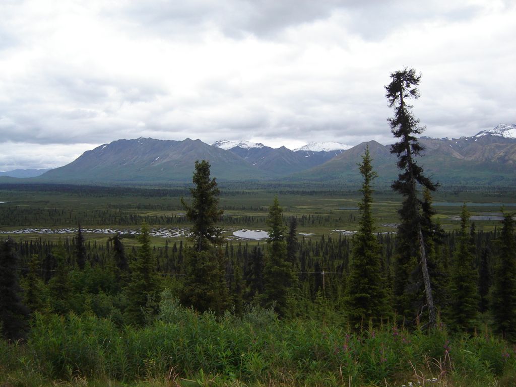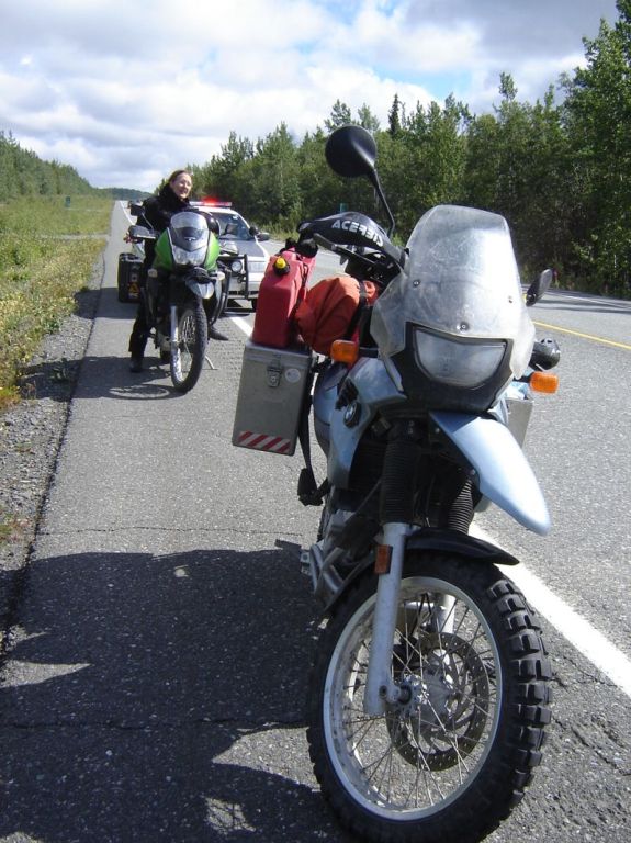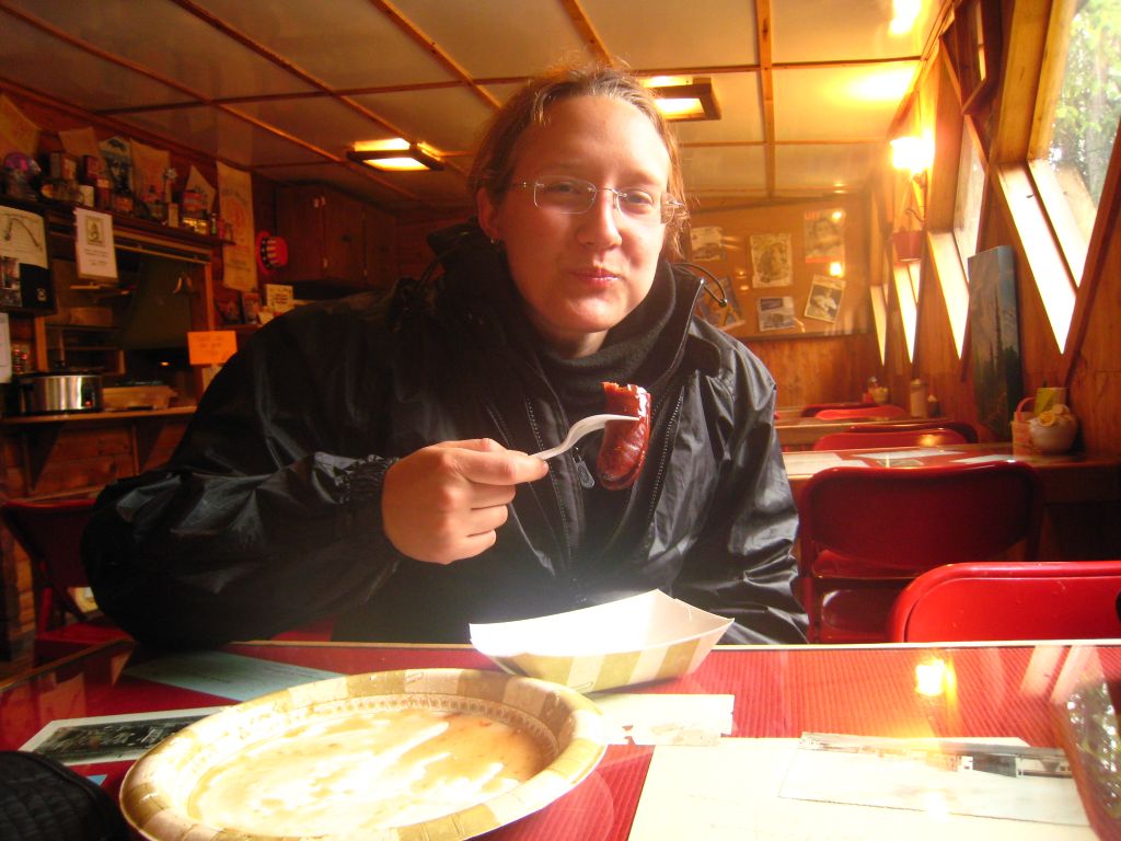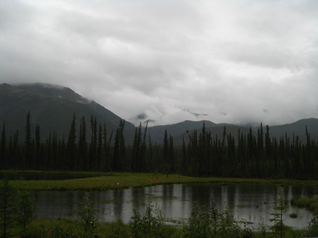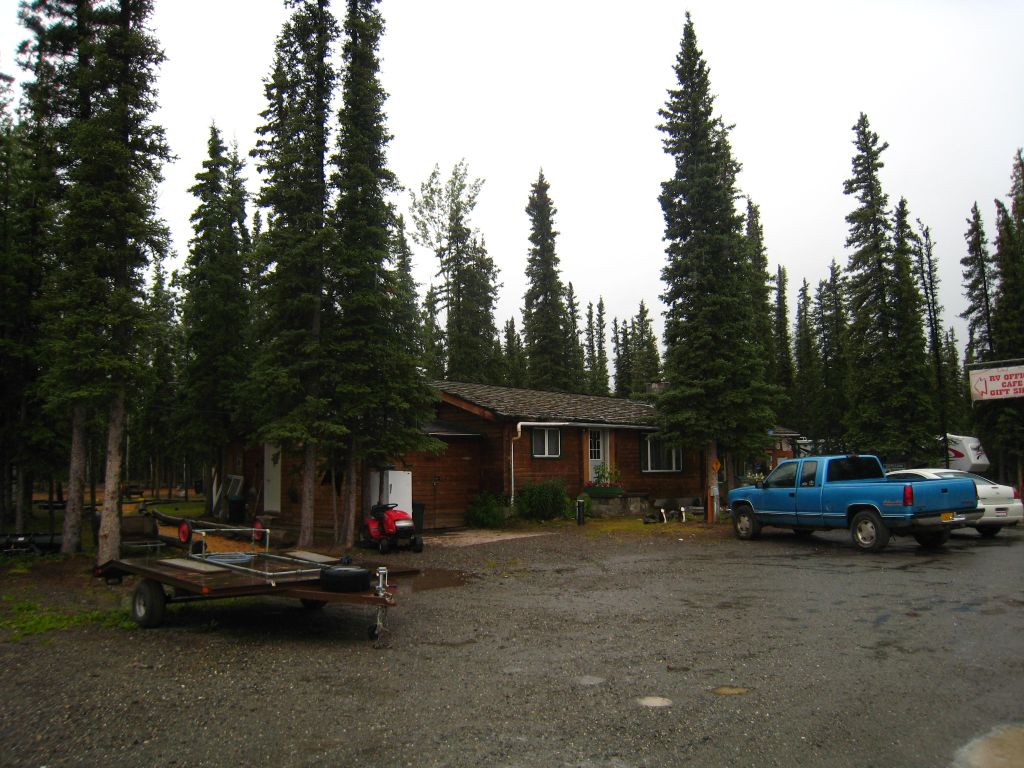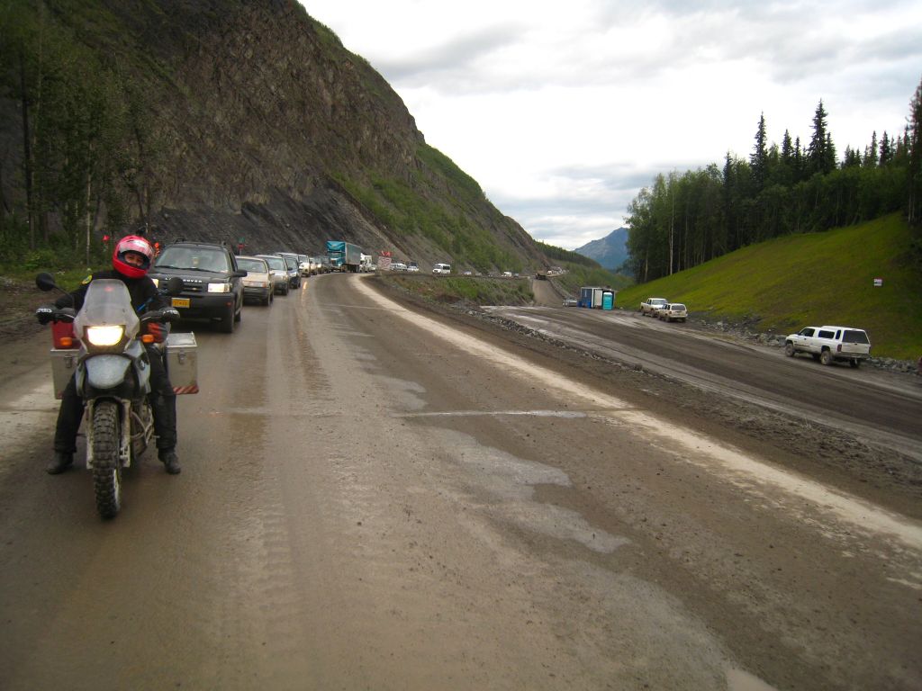 We woke up the next morning in Tok, AK to the sound of pouring rain. We got dressed and parted ways for a bit while she went off to dry her overpants in the campground’s laudromat, while I tore down camp and loaded up the bike. The next hour was a Spinal Tap-esque comical experience wherein we kept trying to find each other in the maze of roads and RVs all of which looked exactly alike. Eventually we did manage to meet up and walked together to the campground kitchen to get breakfast. They had a buffet – the though of which excited me having been starved of real food for a while, but it turned out to be mostly all you could eat pancakes with some dodgy looking syrup and fruit. I did get to try reindeer sausage for the first time, which was exciting for the entire five minutes of the experience.