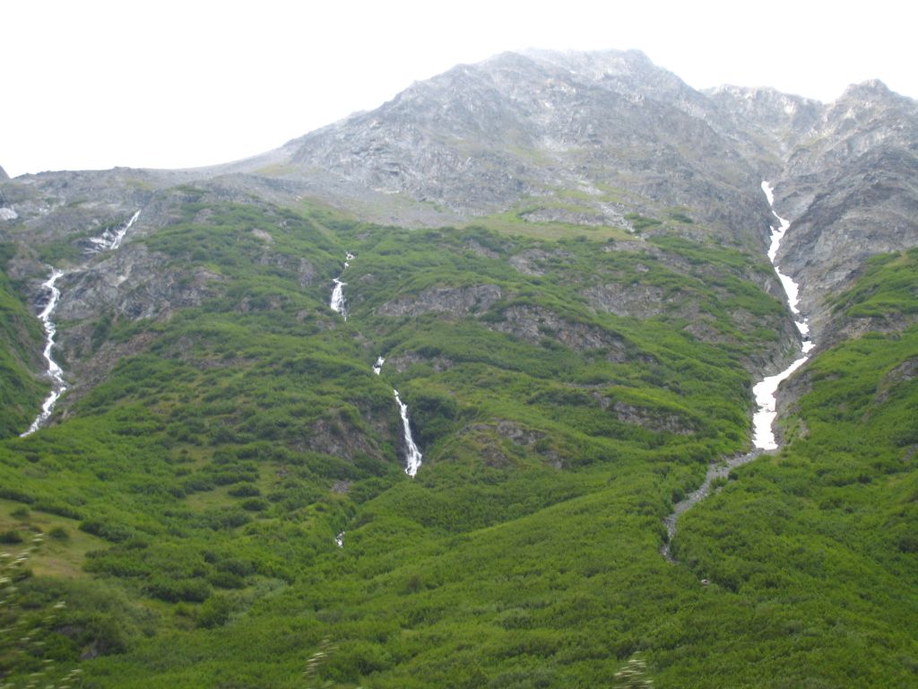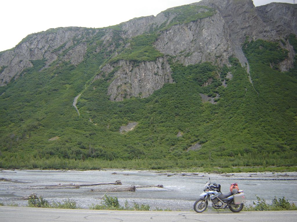 The mountains thronging the Richardson Highway were unbelievably huge and green and lush – again reminding me of the Scottish highlands – and the highway snaked through them in isolation. As I rode, I had this feeling of being the only person on the planet carving my way through unknown territory. It was a strange feeling with mixed emotions – there was triumph, freedom, excitement, fatigue with the slightest hint of danger and fear of the unknown. One thing I did know is that we had to keep going forward and onward.