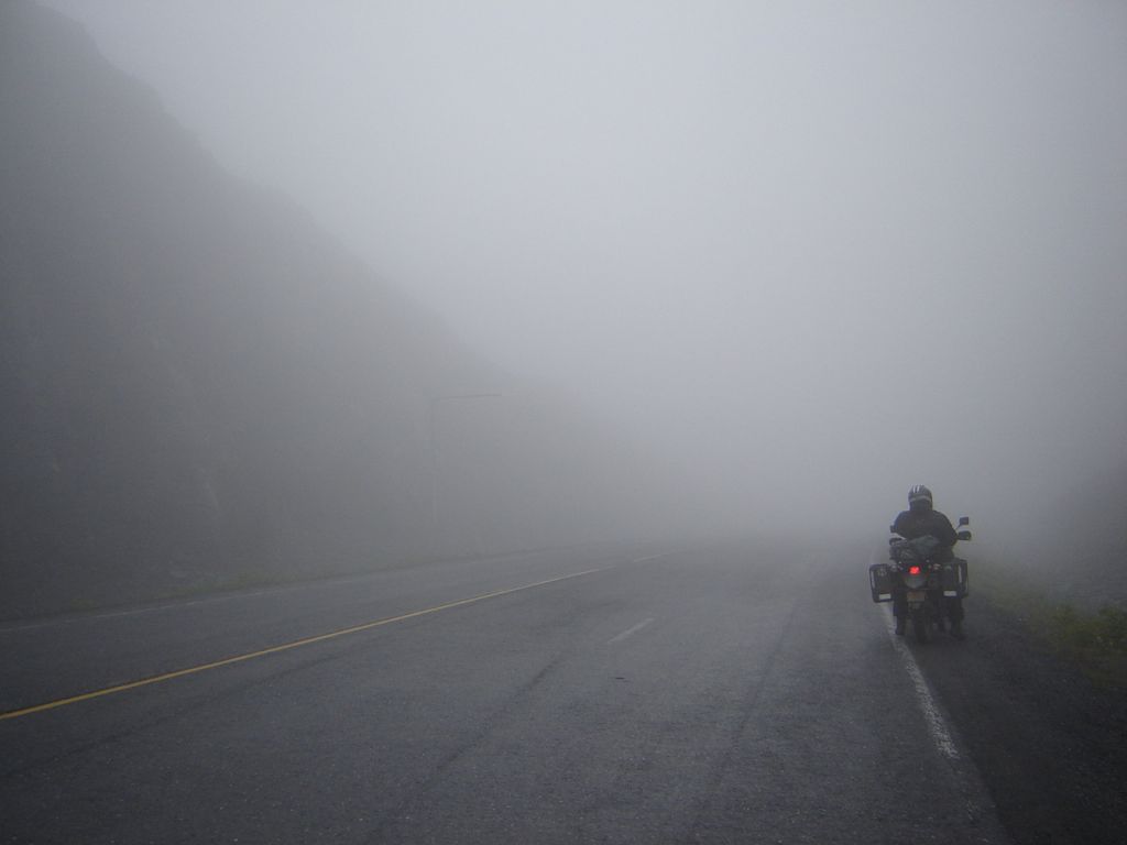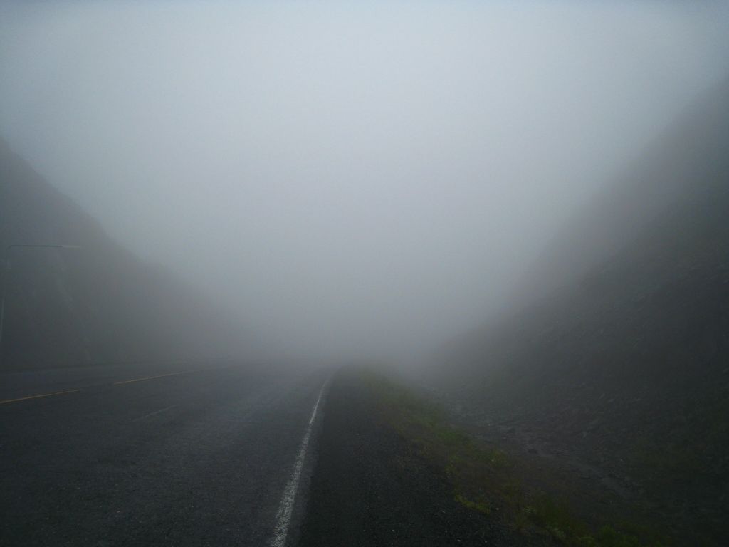 Visibility suddenly went plummeted so that we could barely see 30 feet in front of us and we were forced to slow down and crawl along. Suddenly the beautiful valley seemed hostile and dangerous. After about fifteen minutes of slow inching along, I pulled over and Sarah stopped behind me. I was feeling a little frustrated. We had almost a hundred miles to go before we hit any civilization but there was no way I could ride at that pace for too much longer. It was too late to turn around and go to Valdez though. As we discussed our options, as if out of nowhere a bicyclist rode past. We stopped him and asked him how much further the fog was and he told us it would end in just five miles.