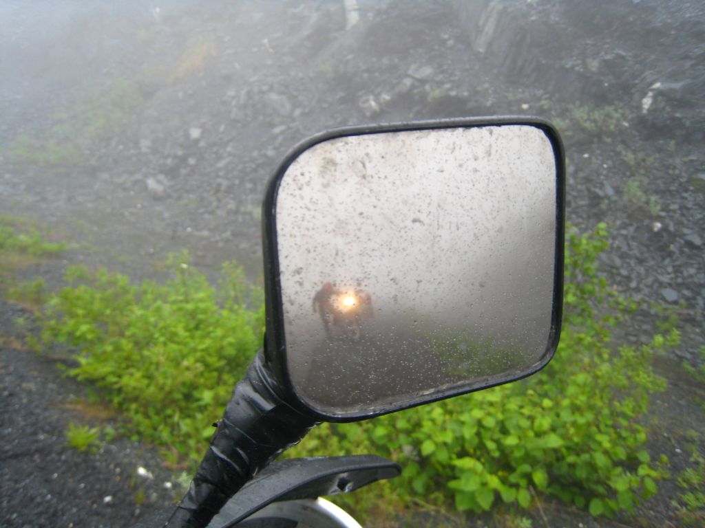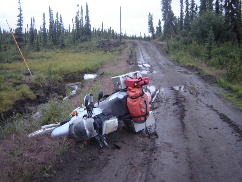 The sixty miles between GlennAllen and Slana were an ode to willpower. That particular stretch of highway hadn’t been fun the last time we had ridden through it five days ago and it still didn’t have very much to commend it. We went a steady clip of 70mph on a lacklustre road where everything looked gray and blurry, punctuated with gravel patches – gravel not bothering me anymore as we rolled straight on through it. It was raining profusely now.