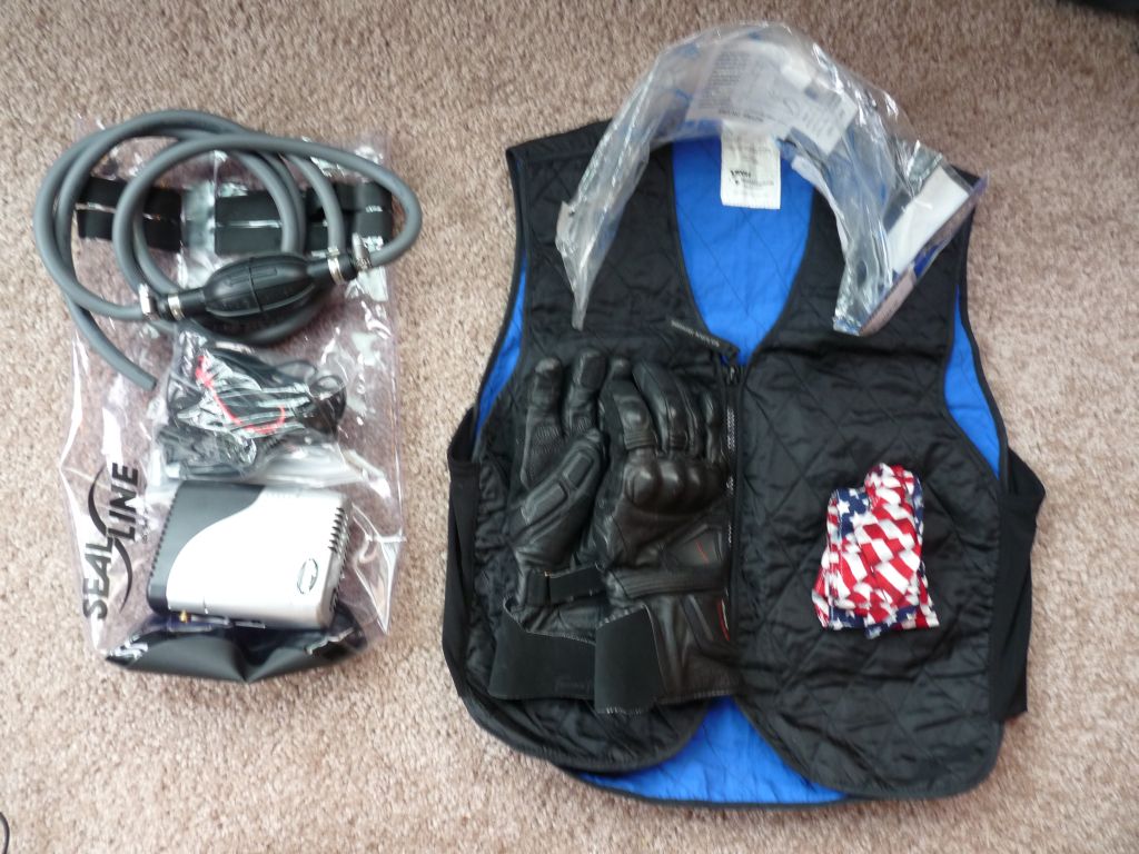 Cooling vest – It does what it says – you soak it in water and wear it under your jacket. I have omitted this and just doused the shirt I was wearing in ice water. Nice air conditioned ride!